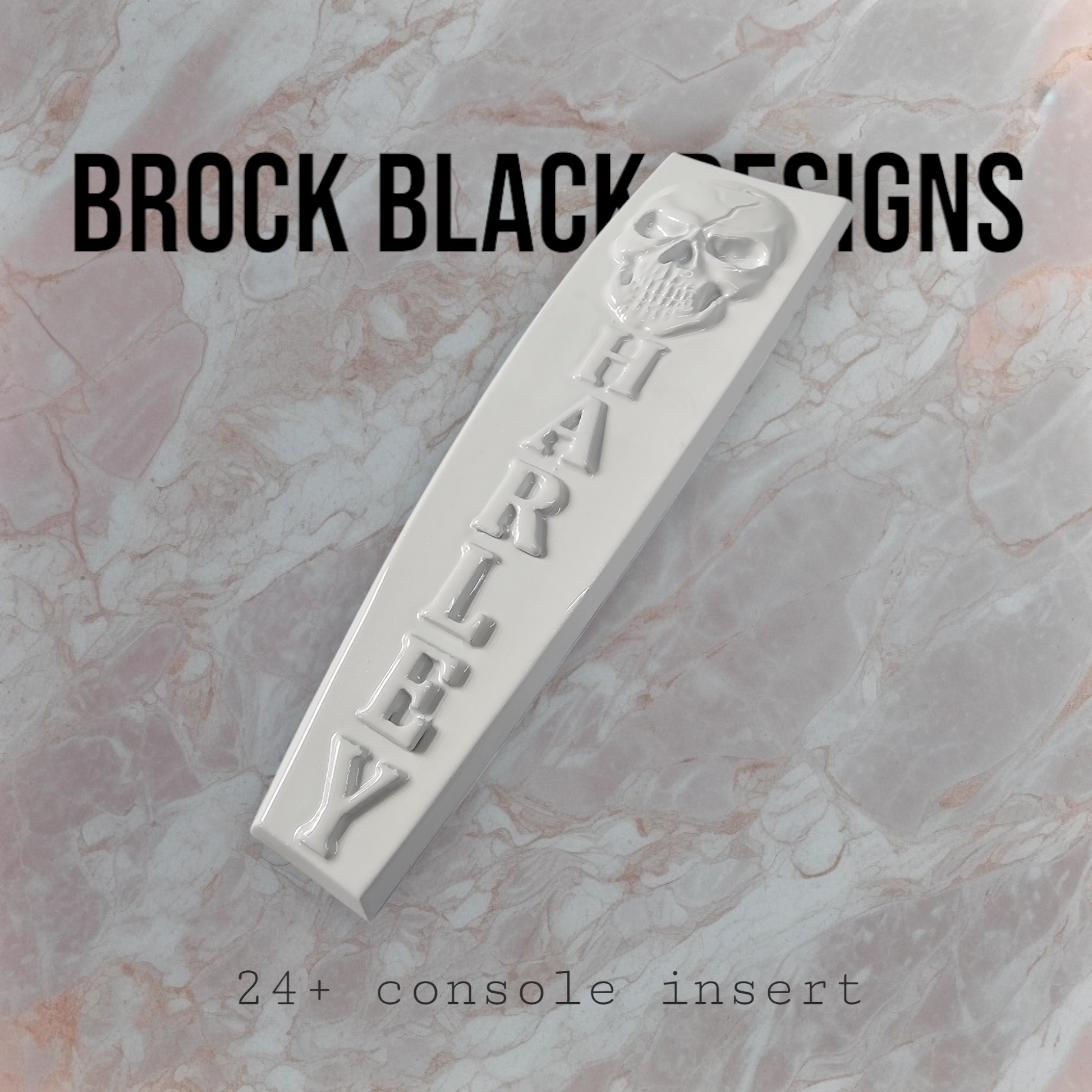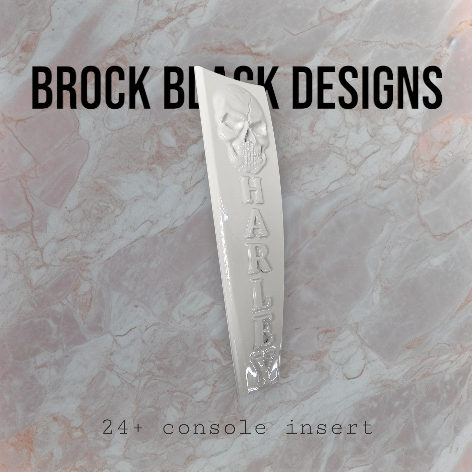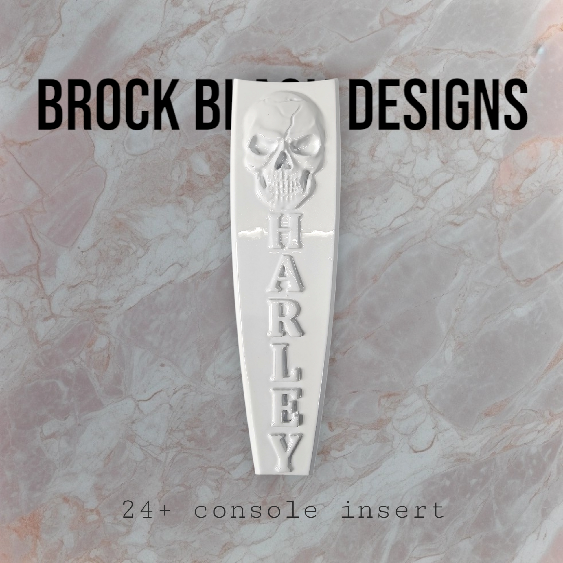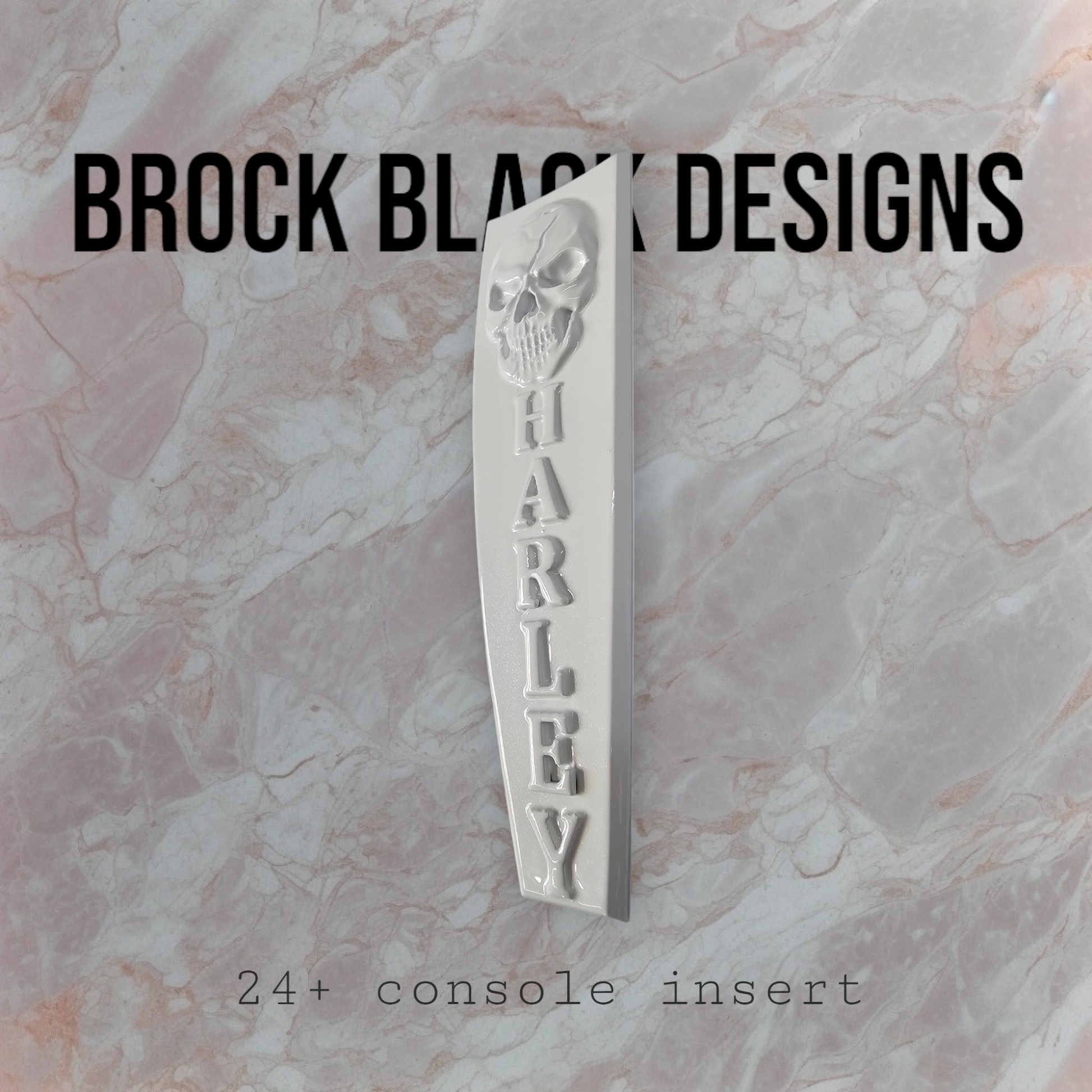Custom built Harley console insert with 3D skull flag theme. Can do any design, color combination or style of bike. These are individually built and designed for the customer. These take about 3 weeks to build. We will verify information after the order is placed. Contact us if you have any questions or special requests. Measures 2 1/4 top, 1 29/64 bottom and 8 11/32 length. Does not fit some 21+ touring models consoles.