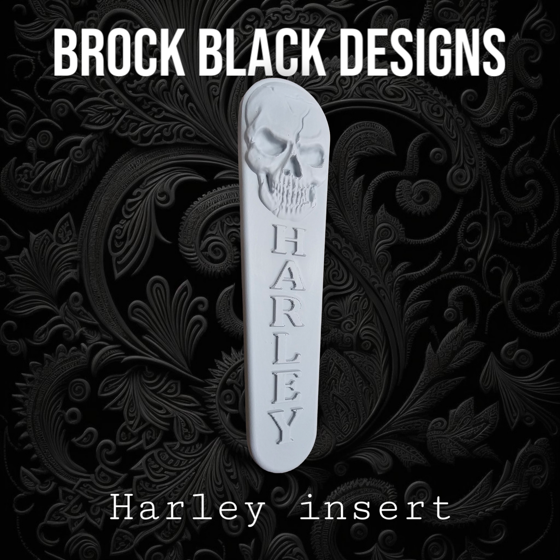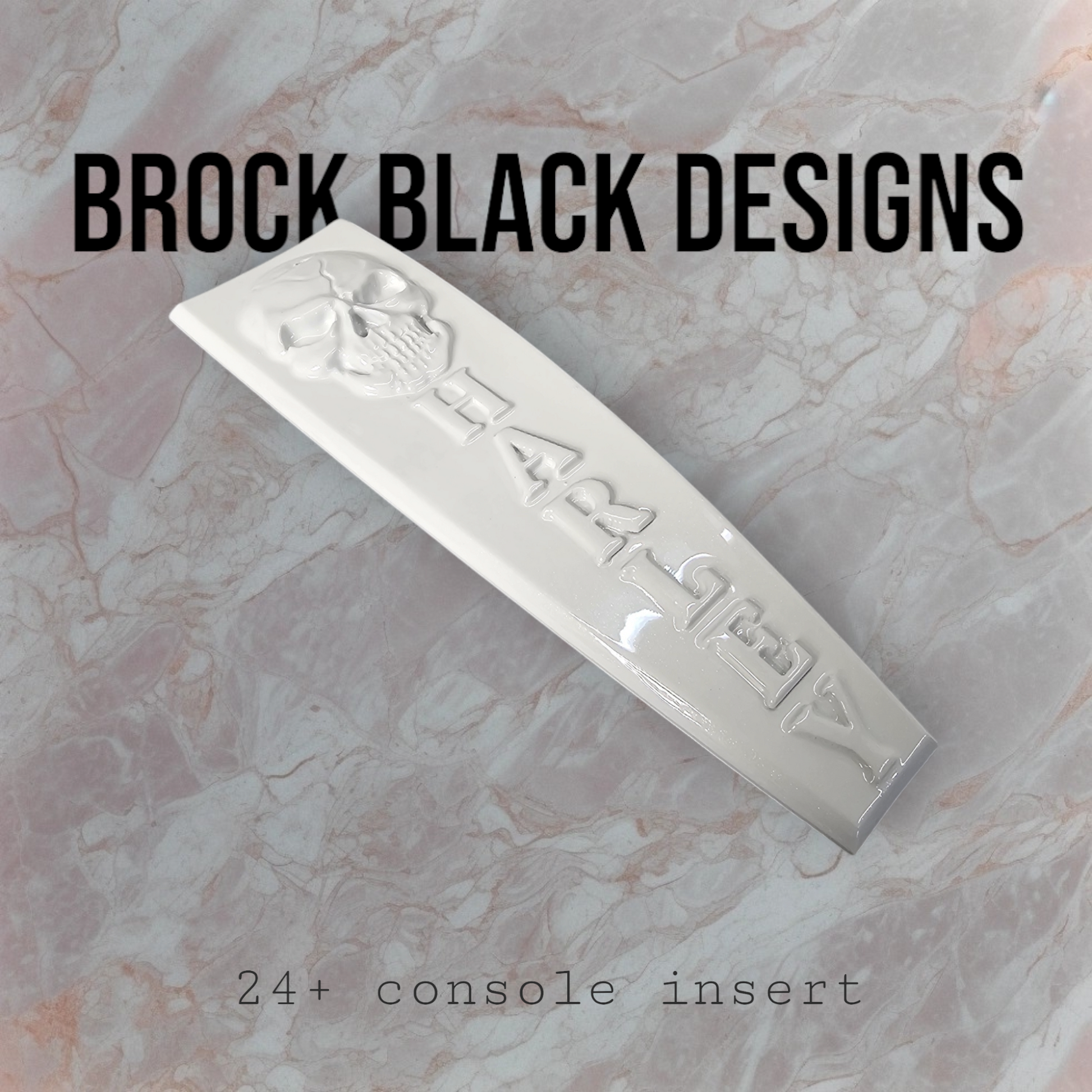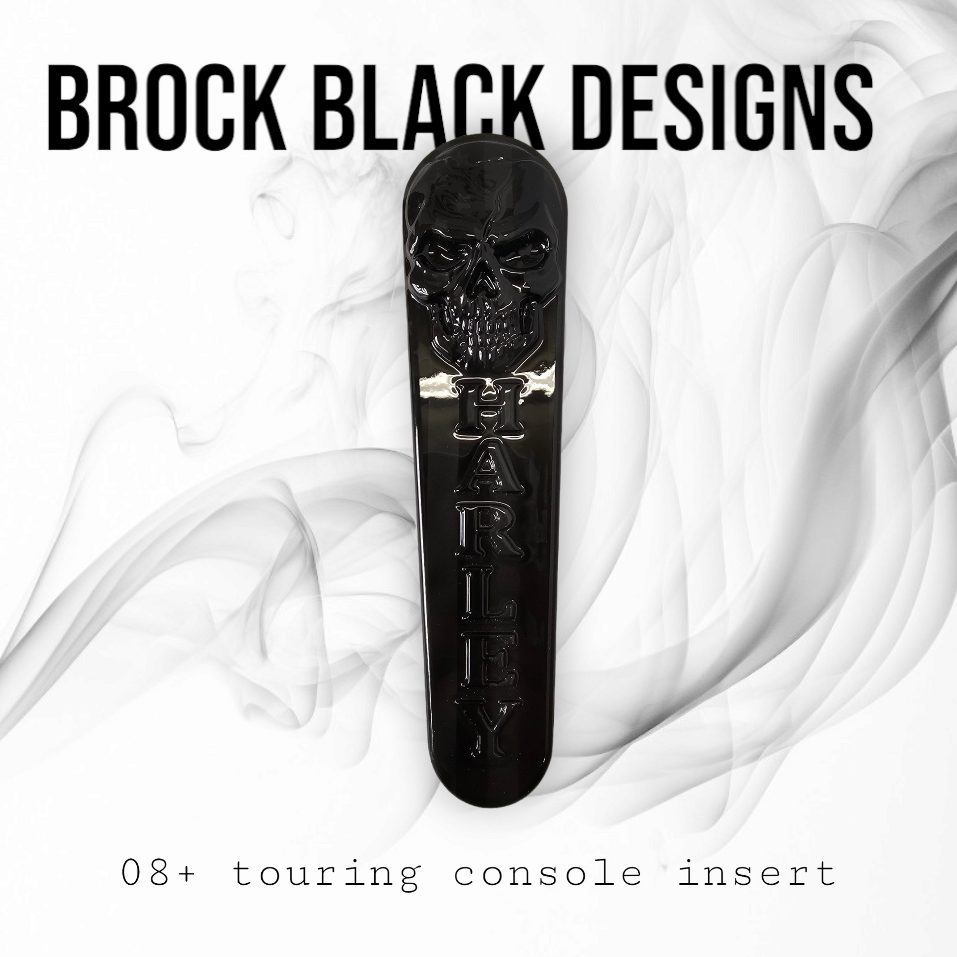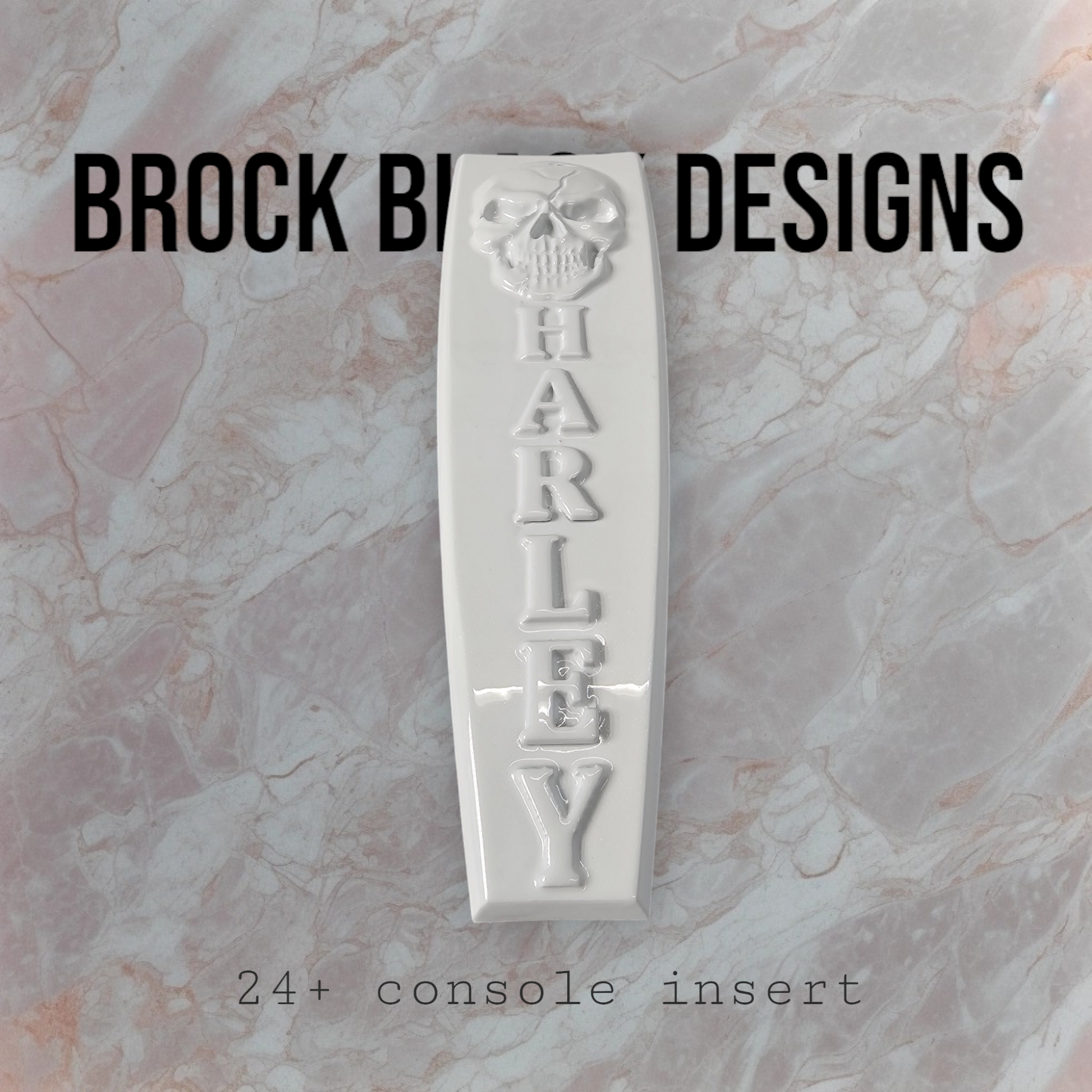 Custom built Harley console insert with 3D skull flag theme. Can do any design, color combination or style of bike. These are individually built and designed for the customer. These take about 3 weeks to build. We will verify information after the order is placed. Contact us if you have any questions or special requests. Measures 2 1/4 top, 1 29/64 bottom and 8 11/32 length. Does not fit some 21+ touring models consoles.